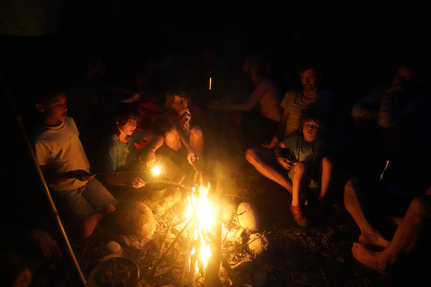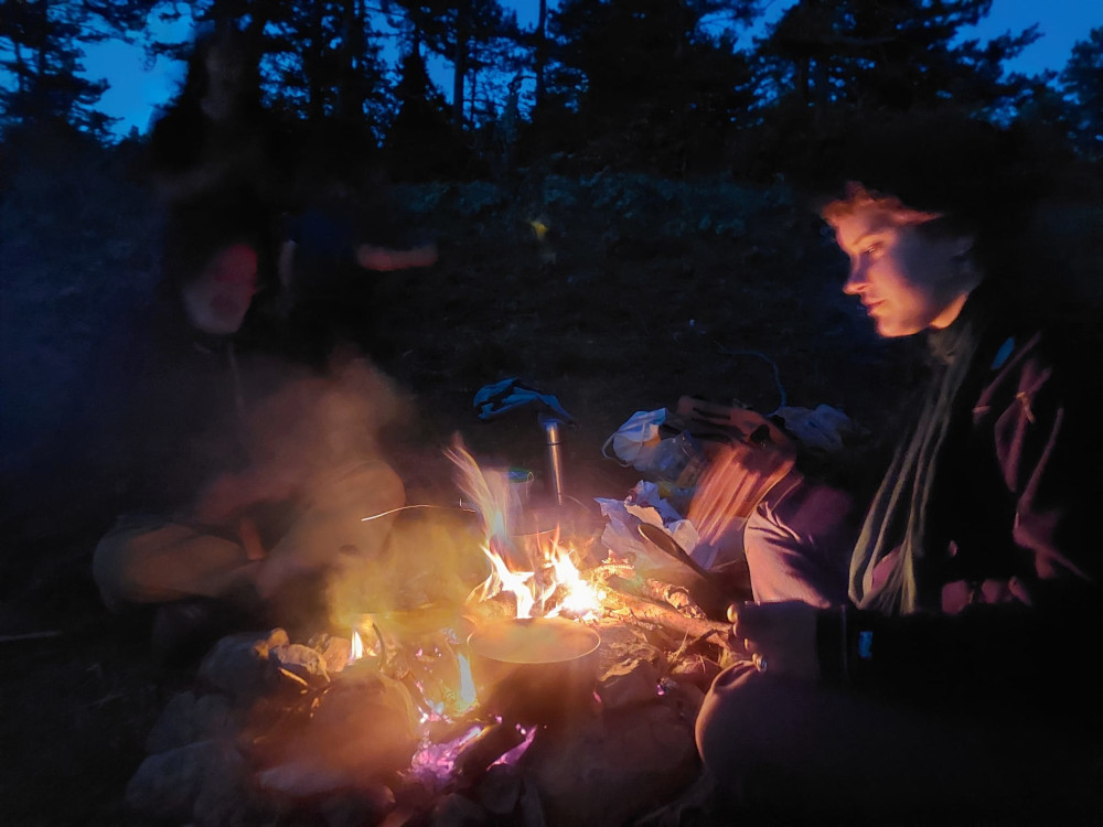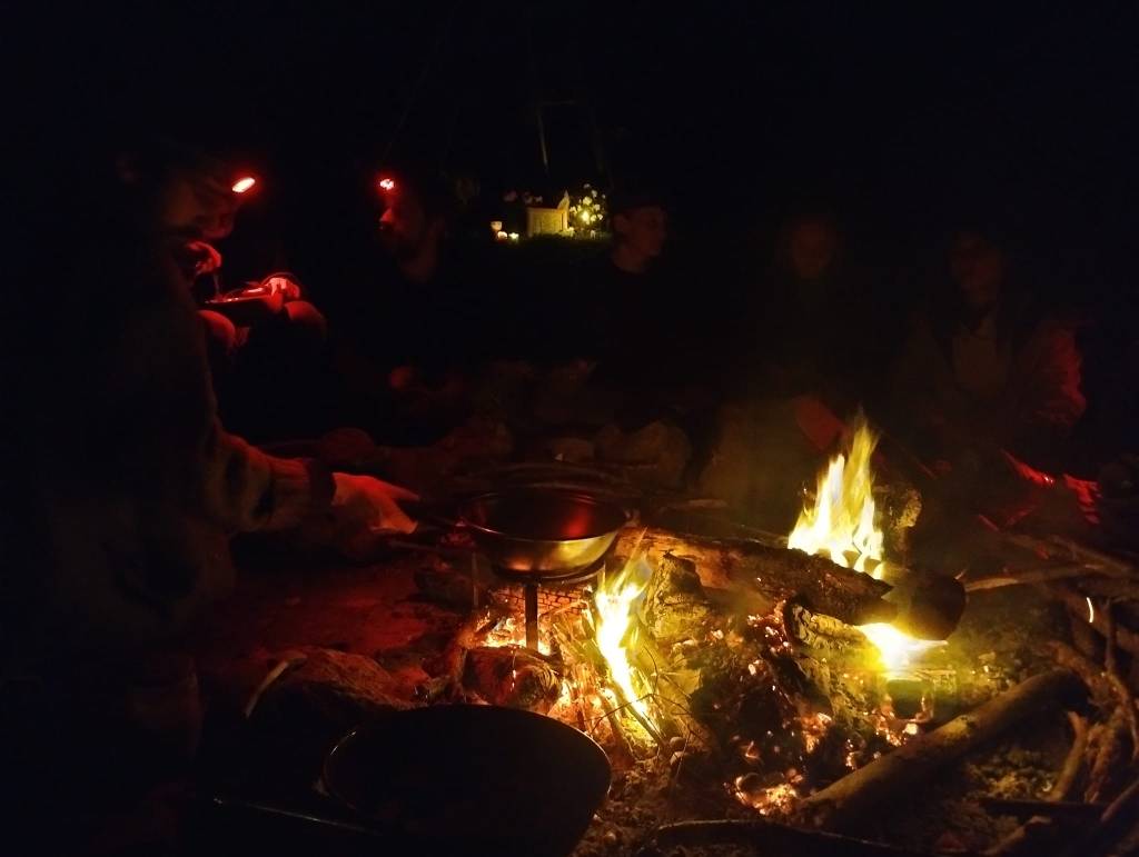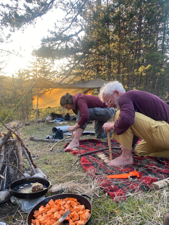 Pas de montre : pas de temps qui presse, mais une continuité pleine et vaste. Cuisiner quand la faim se fait sentir, préparer son campement quand la nuit tombe, prendre soin de ses besoins individuels avec la confiance que le collectif veille sur chacun et que chacun veille sur le collectif. La contemplation de la course du soleil en guise d’horloge et le temps qui s’étire dans la douceur de la présence.