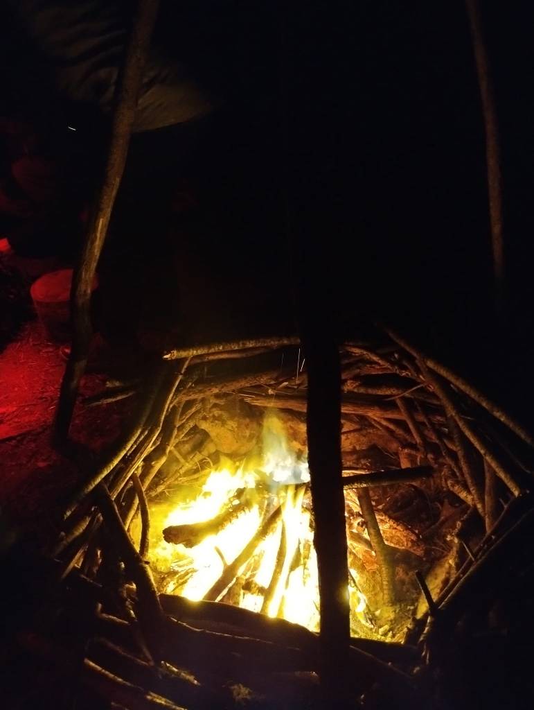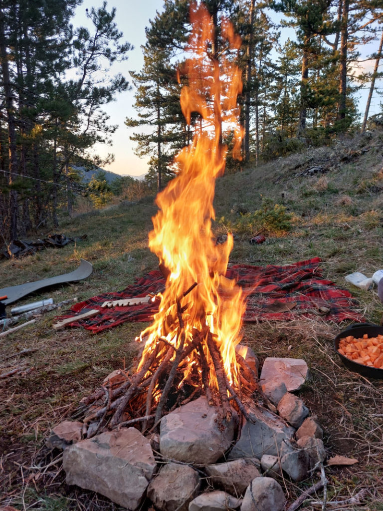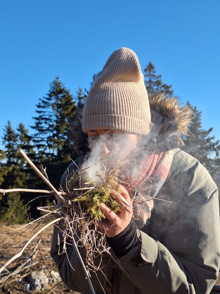 Faire du feu : la base. Pour manger, cuisiner, se réchauffer, faire fondre la neige pour avoir de l’eau. Chercher du bois, faire tourner sa drille à l’aide d’un l’archet, confectionner un nid pour recueillir une braise, faire naître la flamme du bout des doigts. Répéter des gestes pluri-millénaires pour être traversé dans son corps par des mémoires anciennes.