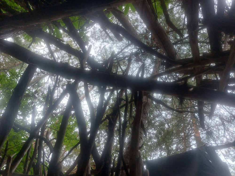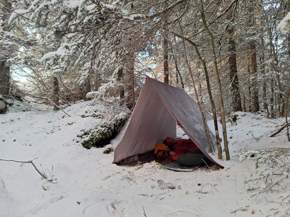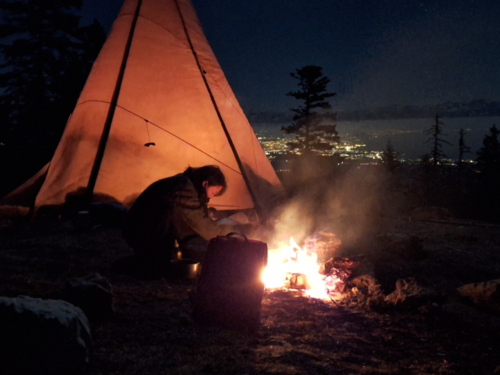 Monter le campement. Une litière d’épicéa, des perches pour le tipi, le feu : ça y est, nous sommes chez nous.