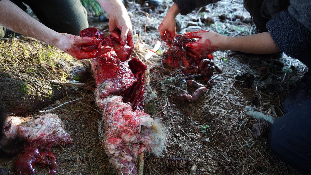 La vie simple de la forêt hivernale : dépecer un blaireau ramassé au bord de la route, tanner sa peau à l’aide de sa cervelle et à l’aide d’écorces tanniques. La chair à nu. Remettre la mort au cœur du vivant dans la vie quotidienne.