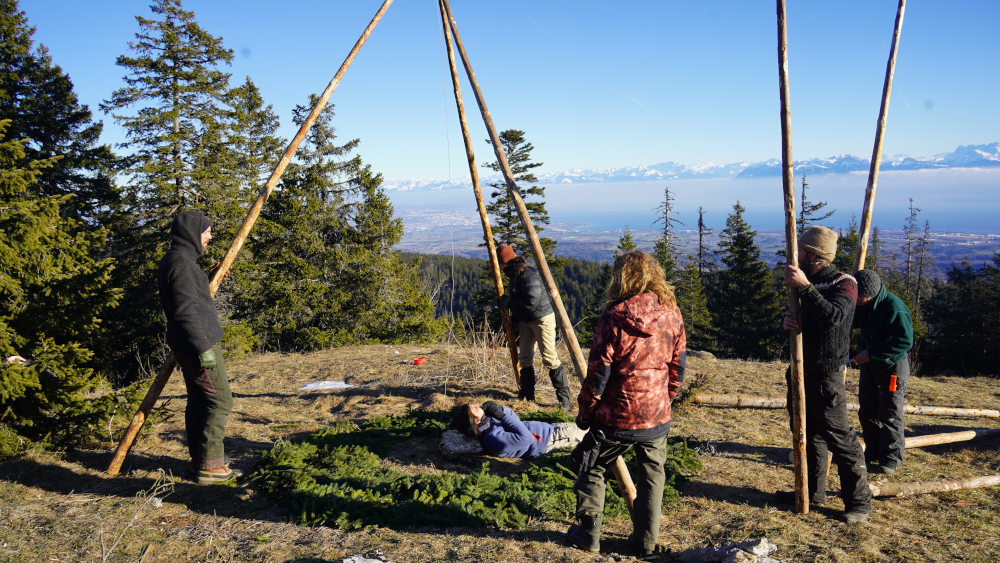 Je plante le décor : Nouvel an 2026, col du Marchairuz, 1500m d’altitude, Jura Suisse. En immersion sauvage et tribale hivernale sous les bons auspices des extraordinaires Pâris et Cancan de Vie sauvage. Il doit faire autour de -5/-10° : les hommes ont des glaçons dans les moustaches.
